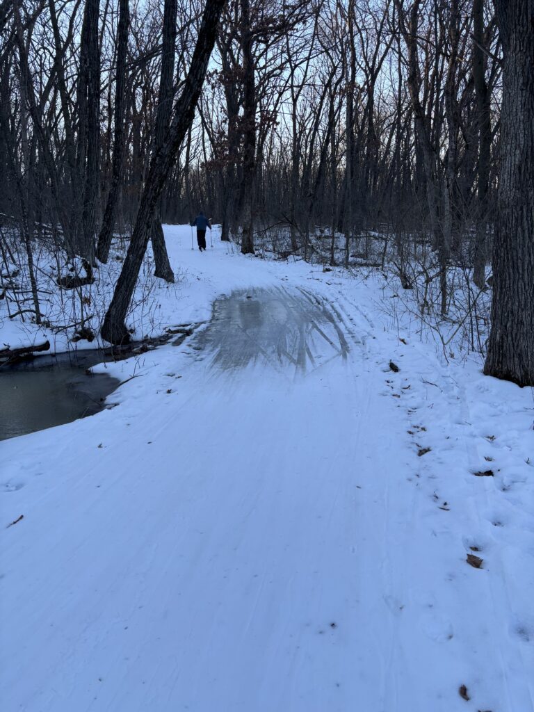 The ski trail was not set with a classic track, but it remained open for both classic and skate skiing. Snow cover was thin in places, with a few small bare spots along the trail. There was one notably icy section just after the first downhill. This area was clearly marked during the event, and volunteers worked to improve conditions by packing snow over the ice ahead of time.