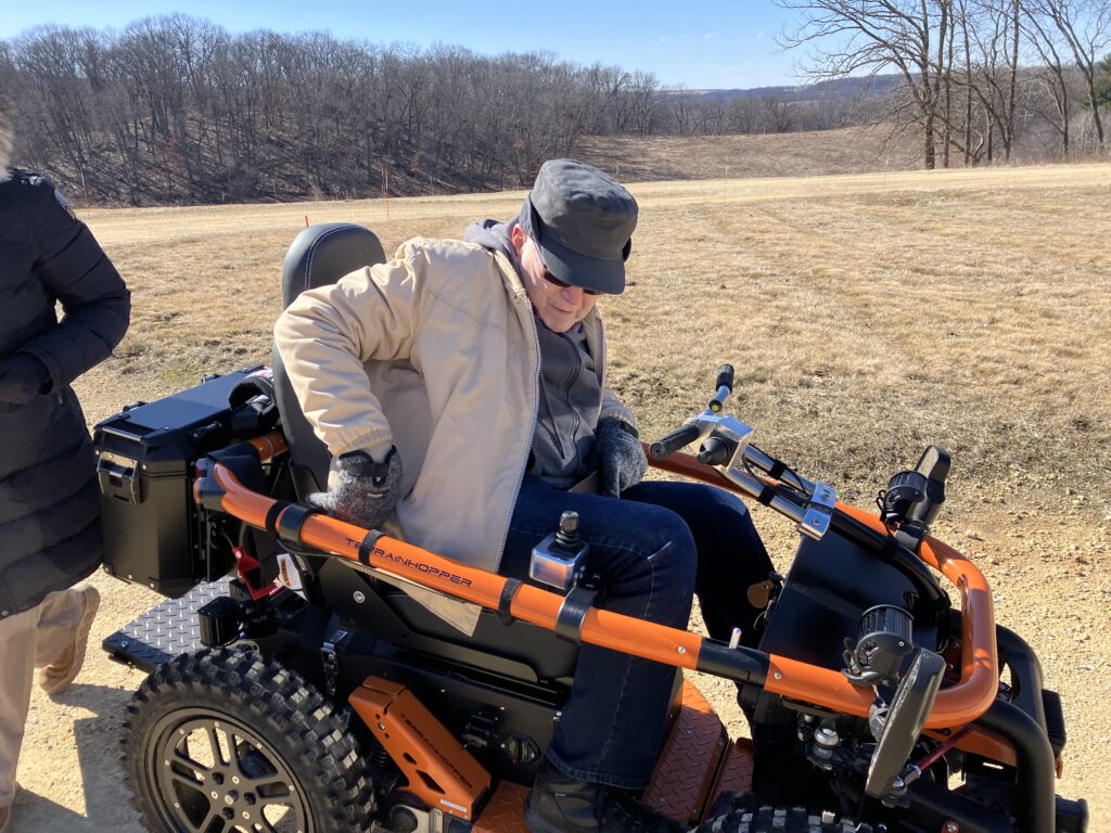 The Friends of Blue Mound State Park are looking to purchase an all-terrain chair or electric mobility device to help visitors with limited mobility enjoy the park. On February 25, 2026, board members William Van Haren and Jim Reynolds, along with Park Superintendent Kevin Swenson, visited with a neighbor and tested their Terrain Hopper – one type of all-terrain mobility device. Research is ongoing to determine which device is best for the park’s terrain and the needs of park visitors.